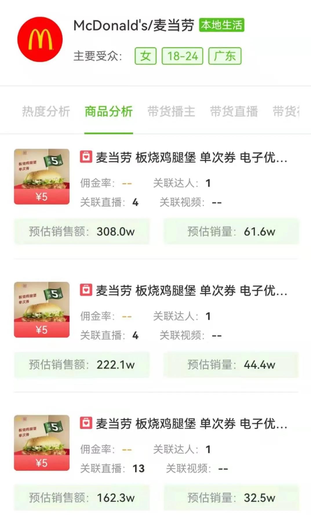 同时,知名餐饮品牌麦当劳 也借助88金粉节,加大了在抖音的投放。品牌用经典的板烧鸡腿堡单次券 作为直播间主推爆品,8月累计卖出139万单,成为8月黑马单品。