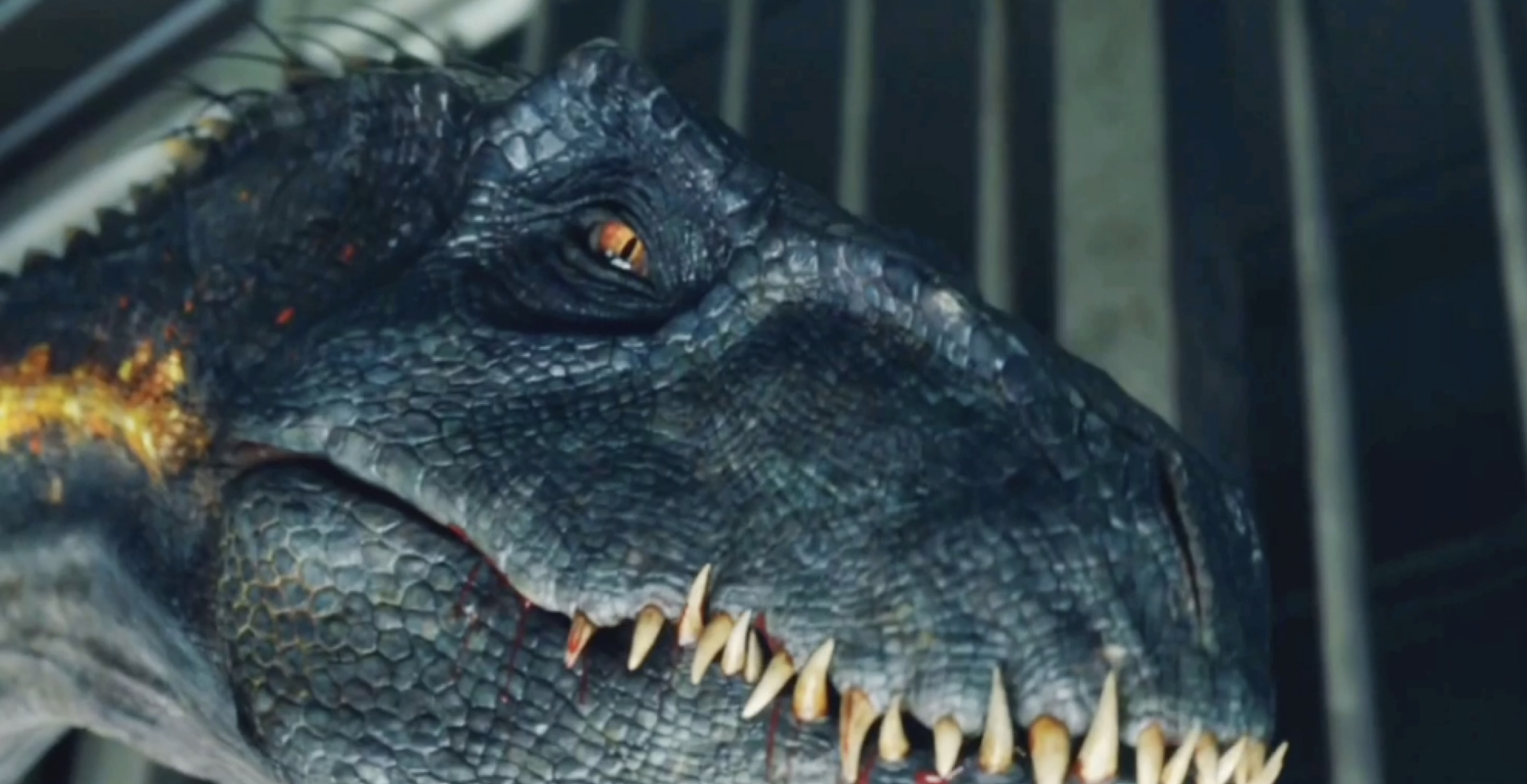 它的主基因是霸王龙,咬合力强到能咬碎防弹玻璃,更大的尺寸得益于南方巨兽龙的基因,完全体的高度达到6.7米,长度16.9米