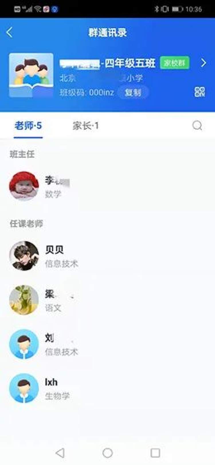家长还可以在“我”模块点击“孩子班级”查看班级老师、学生、家长信息,也可点击某用户头像申请加好友进行交流。