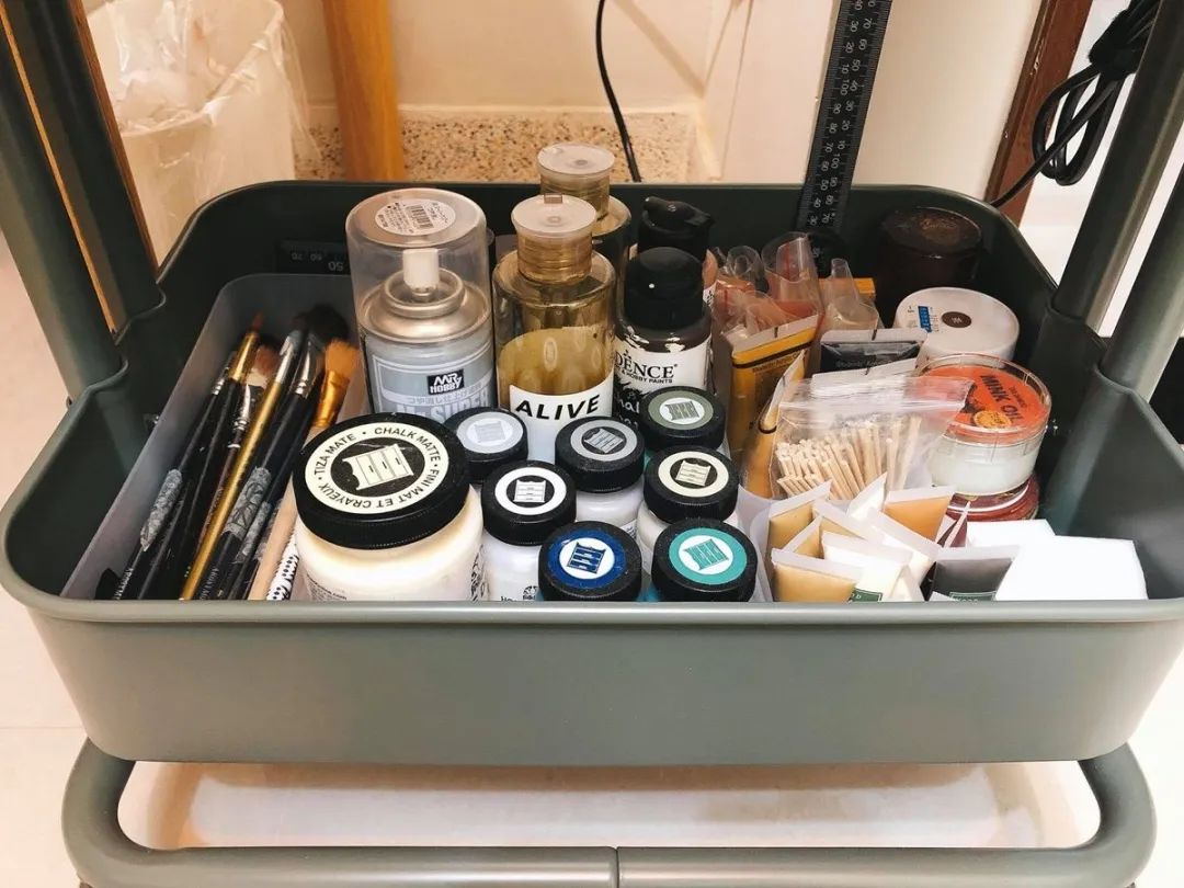 3. 推⾞:IKEA 的绿⾊推⾞是当作缝纫机的推⾞,她拿来放各种上⾊⽤具;另⼀台⽩⾊推⾞不是 IKEA 的,主要是摆放美妆⽤品,上层的⼤创收纳盒强烈推荐给有很多气垫粉饼的女孩们,⽅形的盒身放得下眼影盘、打亮饼、腮红等,上下两层相迭还能有效防尘喔!