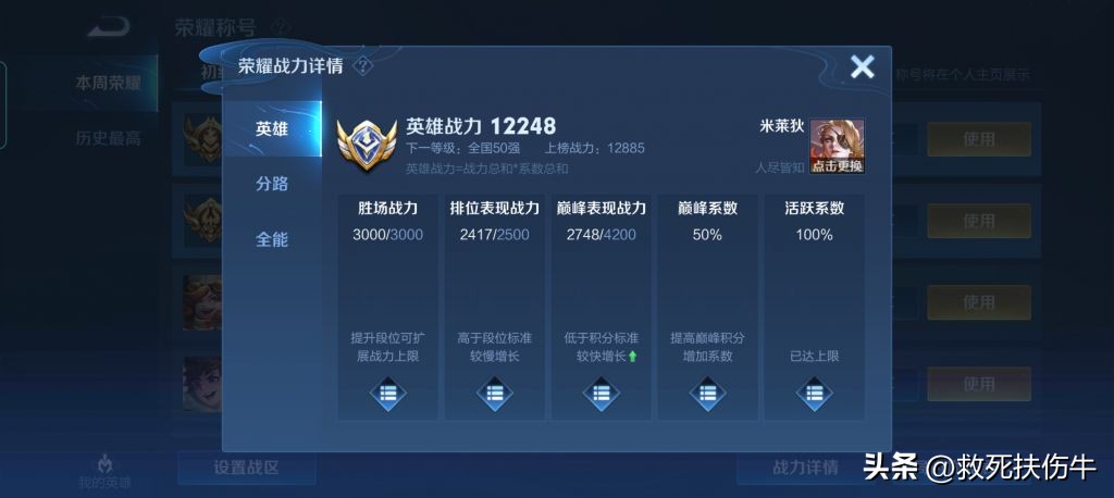 获取方法,打英雄战力就是分为5个维度的战力去刷,上面的胜场战力和活跃系数可以不看,胜场战力基本多打就有了,巅峰赛和排位都行,胜场战力是输了也不掉,打满3000分保底。