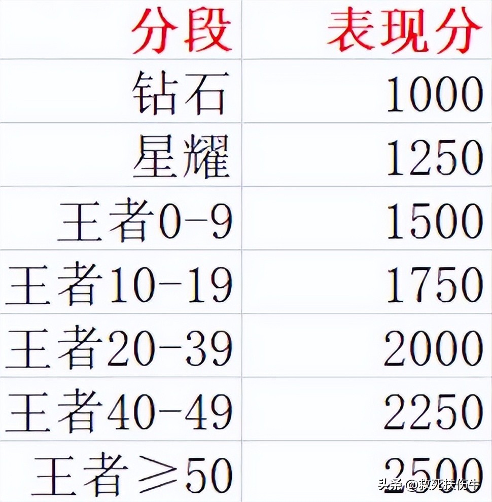 表现分就是排位胜利加分,MVP多加分,败方MVP少掉分这样,在固定段位都有上限,比如星耀最多1200表现分,王者10星就1500表现分,最高王者50星2500分。