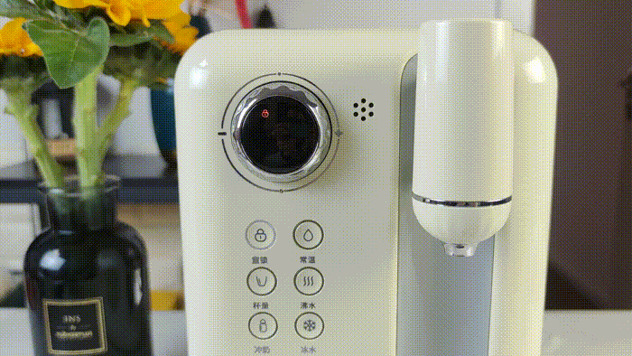 操控区6个按键除了童锁键和杯量键以外,剩下的4个按键都是预置好的温度档,常温26℃、沸水100℃、冲奶45℃以及冰水都是最常用的几个喝水温度值。当然如果你还有特殊温度需求,可以通过上方的温度旋钮来调节,顺时针旋转以5℃单位递增并实时在旋钮屏幕上显示出来。无论加减温度,这个调节旋钮都是十分丝滑,有点开保险柜的感觉。