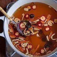 2、将浸泡好的材料连水倒入锅中,加1500-2000ml水大火煮开后,转小火煮40分钟关火,加适量冰糖搅拌至融化后焖10分钟。