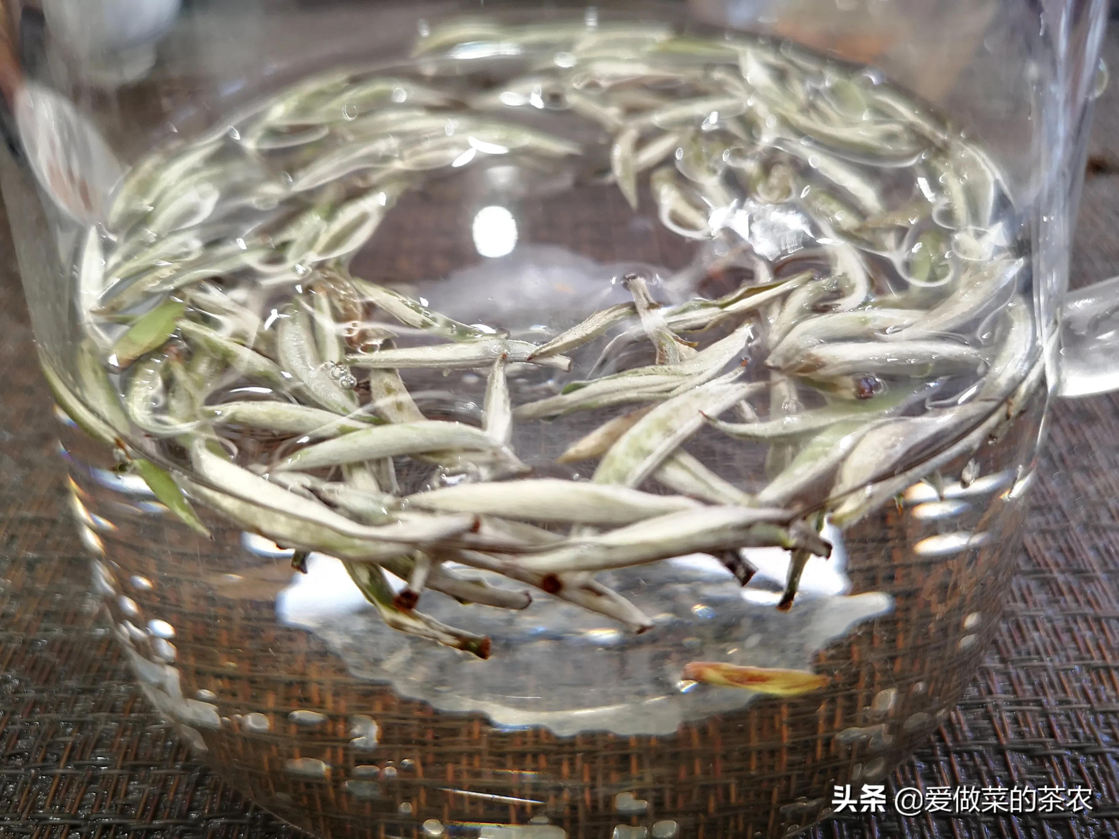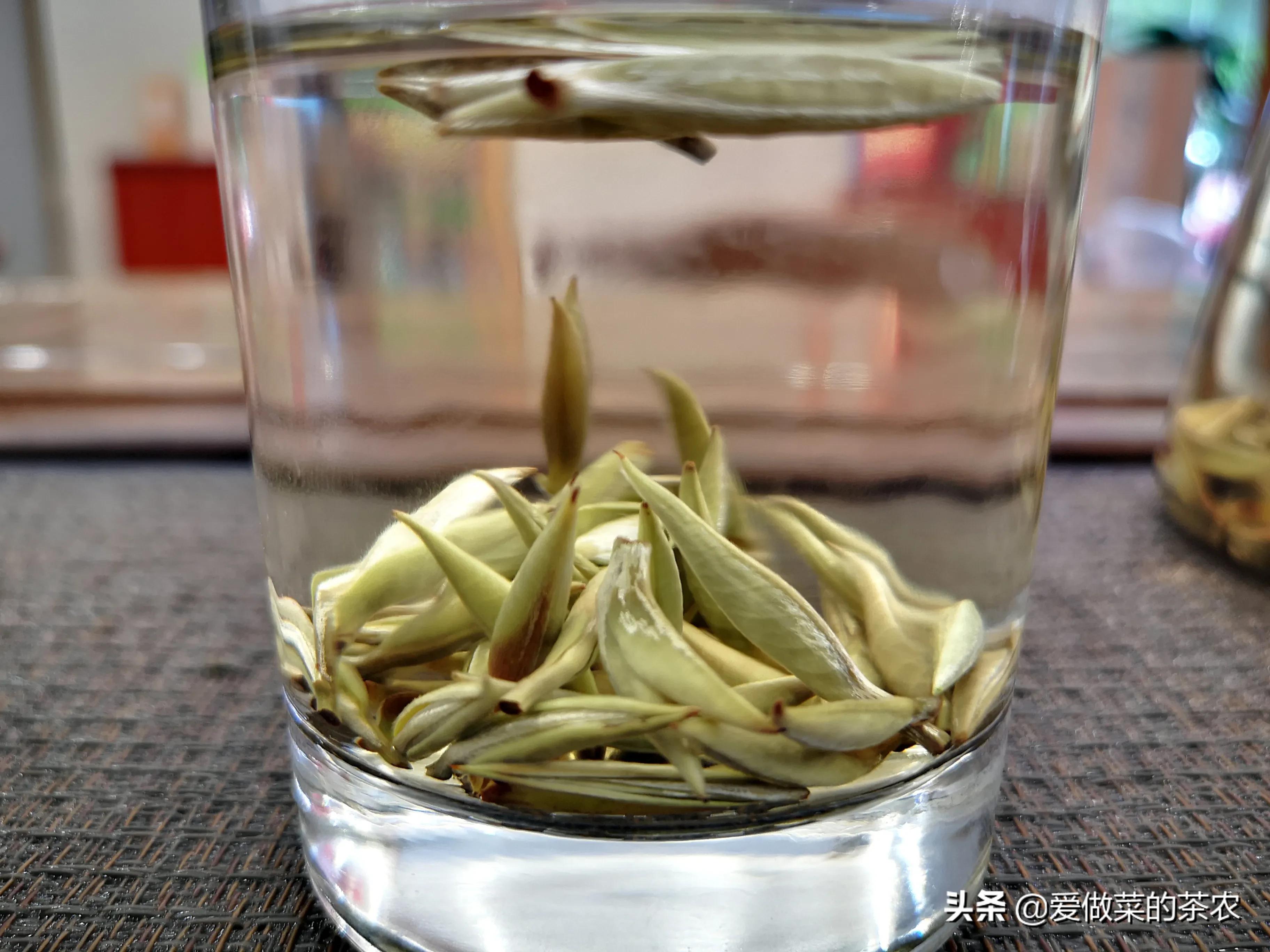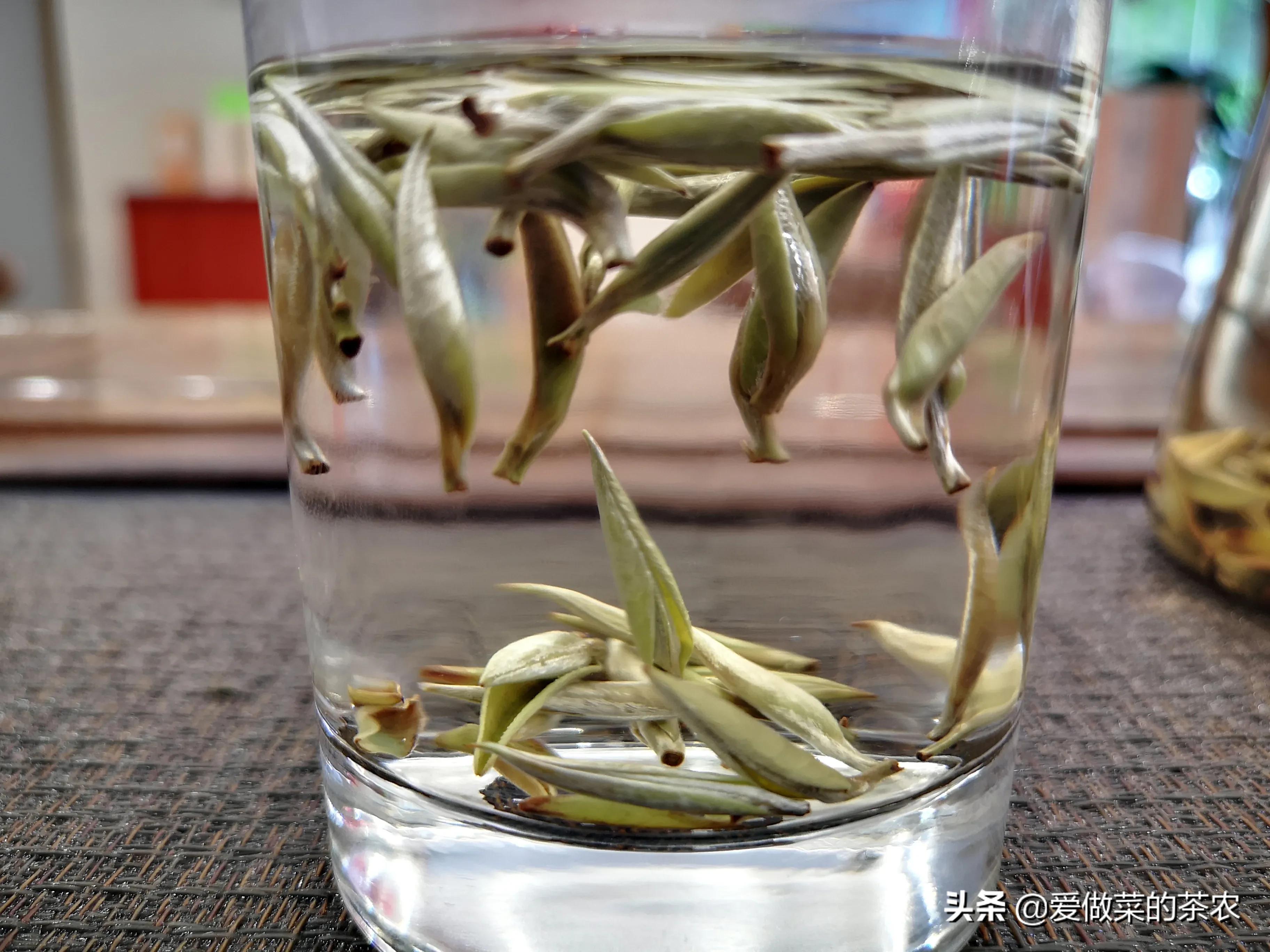 纤维组织没有被破坏,导致这几种以单芽制作的茶品,在吸水的过程中,主要以茶梗部位为吸水的主要部位,导致茶梗吸收水分更多,从而形成了茶芽在水中竖立的现象。