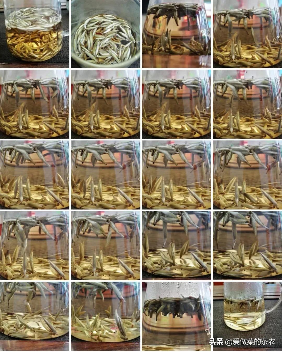 慢慢的,沉入水中的茶芽变得越来越多,几乎每一颗茶芽都会在水中竖立一会,然后就沉入水底倒下。