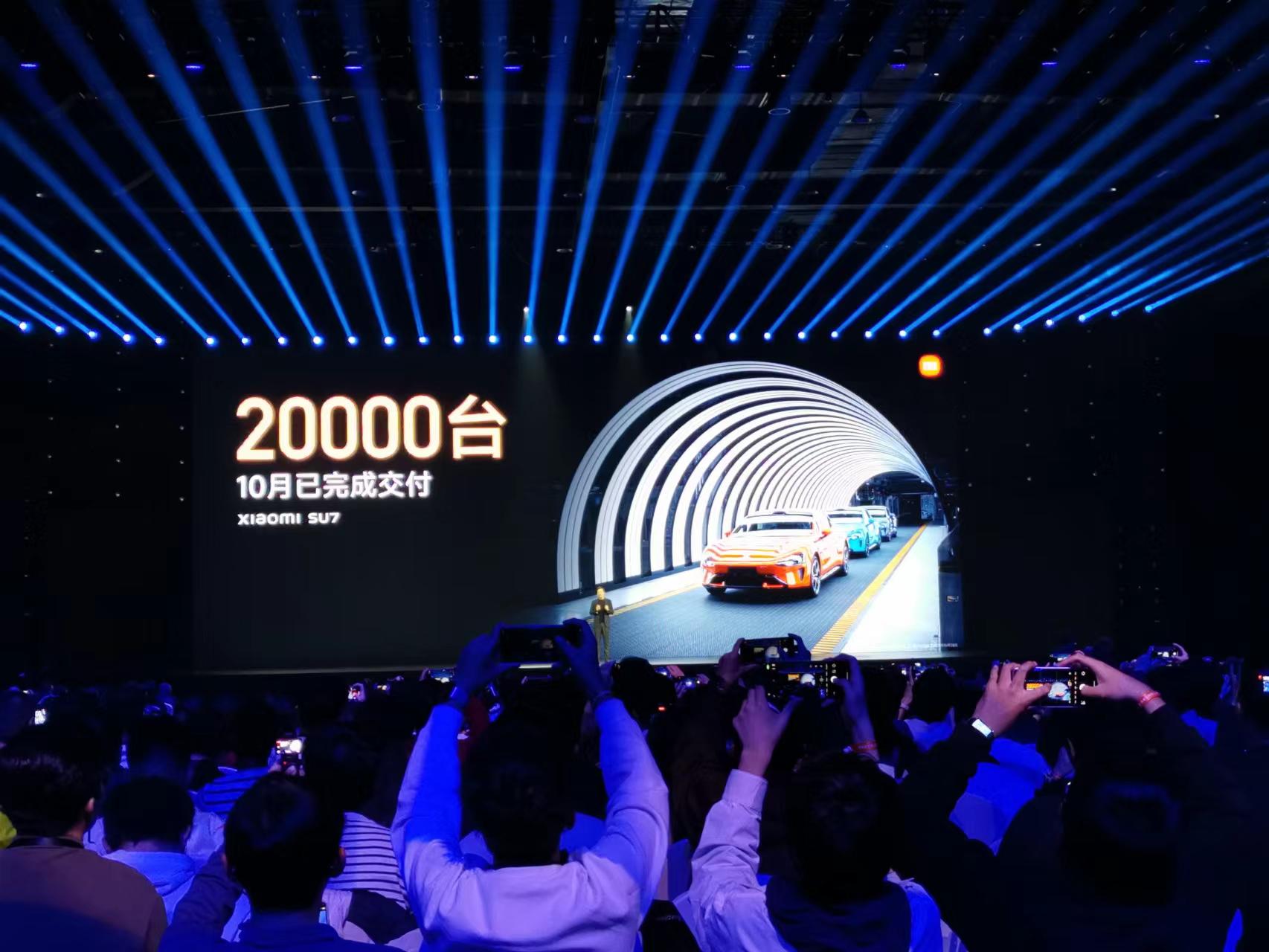 “10月29日上午,小米SU7已完成10月交付2万辆的目标。”雷军现场宣布,这意味着,小米SU7的月交付量将超过特斯拉的Model 3,成为国内中大型纯电轿车第一名。