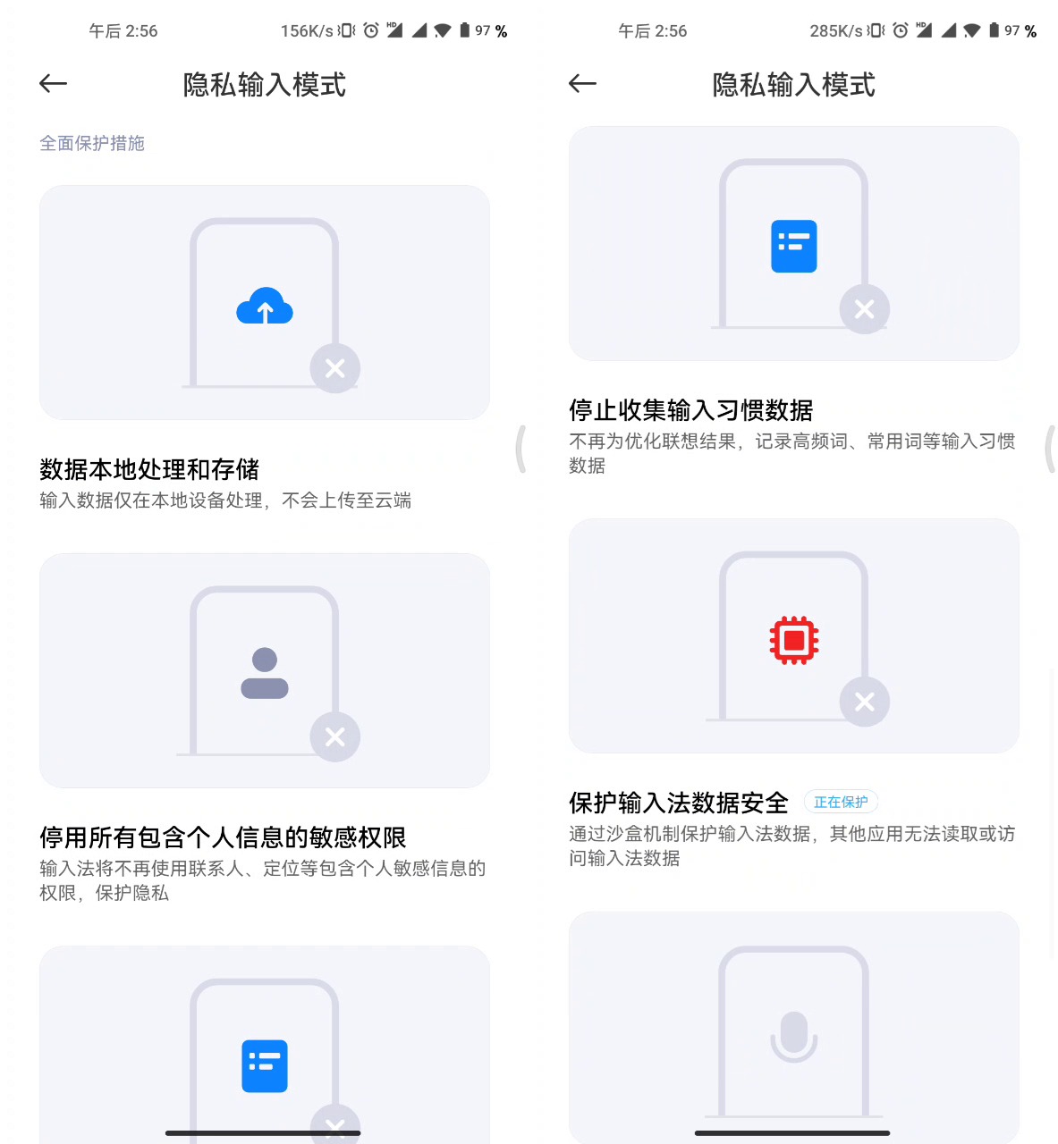 开启后,输入数据完全在本地处理,与云端隔绝,输入法也不再为了优化联想结果而手机输入习惯。