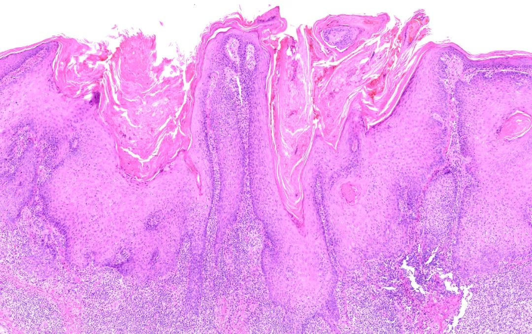 这是一位角化棘皮瘤的患者,病理照片中,皮肤的角栓就像爆发的火山岩浆,皮肤的角质本是安静的存在,当它们喷涌而出,皮肤疾病也汹涌而来。