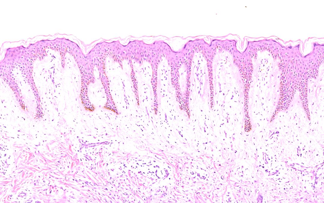 一位皮肤纤维瘤患者的皮肤组织病理镜照片,表皮的增生像脚尖点地的芭蕾舞者们,在皮肤上,翩翩起舞。