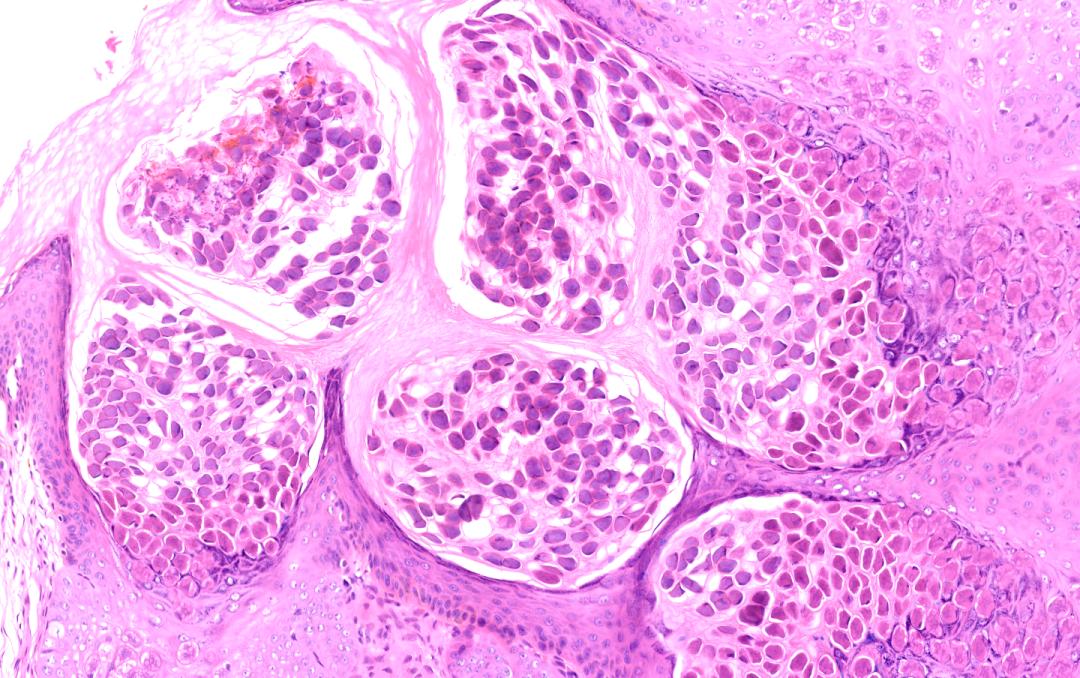 这是一颗面部“黑痣”的皮肤镜下照片,皮损中,不规则的球和黑点,像“黑化”的“蜂巢” ,预示着这颗痣的不寻常——疑似恶性黑色素瘤,彼之蜜糖,吾之砒霜。