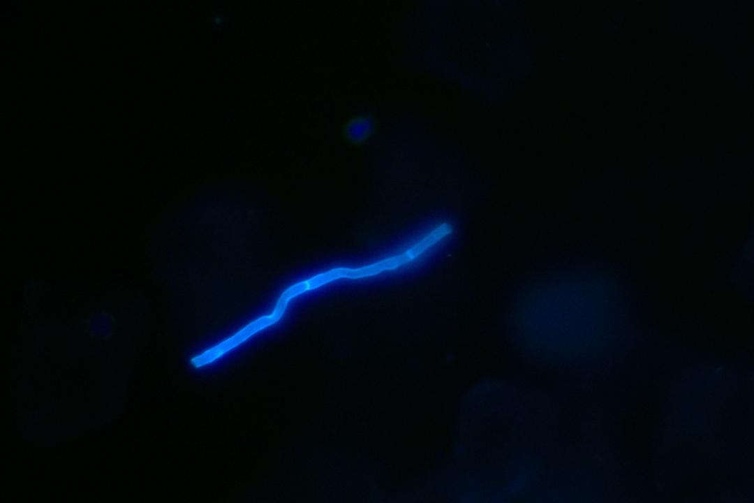 荧光镜检下的真菌菌丝,像一条孤单蠕动的草履虫,菌心所向 素履之往,不知它将去向何方,但它着实带来瘙痒。