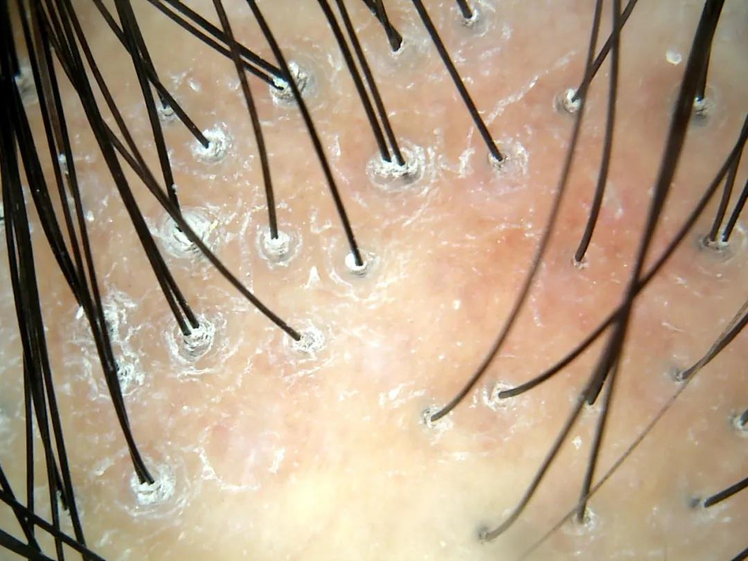 这是一位毛发扁平苔藓患者,毛囊开口的毛周管型,像月色下的毛塘泛起的阵阵涟漪。