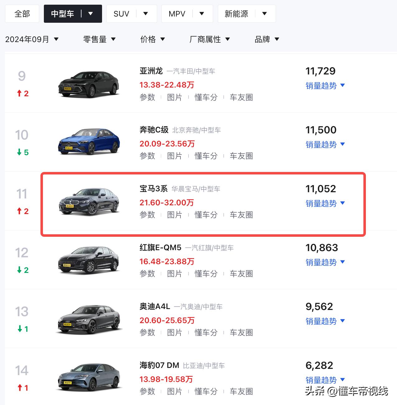 目前,宝马3系是国内销售的中型轿车热门车款之一,今年9月销量为11052辆,略低于奔驰C级(指导价33.48万-38.06万元),但领先于奥迪A4L(指导价32.18万-40.08万元)、凯迪拉克CT5(指导价28.97万-34.17万元)、沃尔沃S60(指导价30.69万-38.49万元)等车型。相比同级车型,您觉得新款宝马3系此次改款是否会更有吸引力呢,欢迎评论区聊一聊。