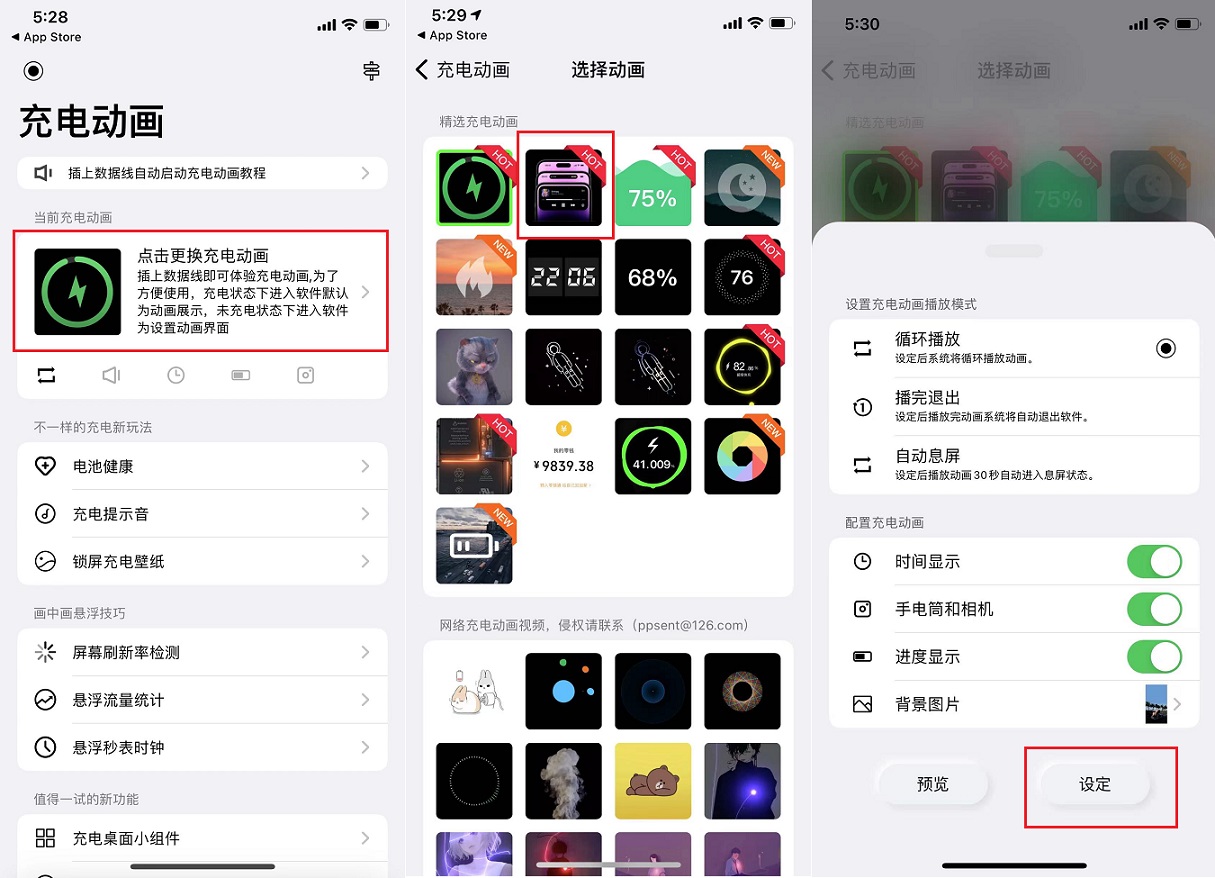 安装之后,点击“更换充电动画”,接着点击APP最近新增的「灵动半岛」充电动画图标,之后根据需求设置充电动画播放模式和配置充电动画,比如设置背景图、时间等等。之后点击“设定”即可,如图所示。