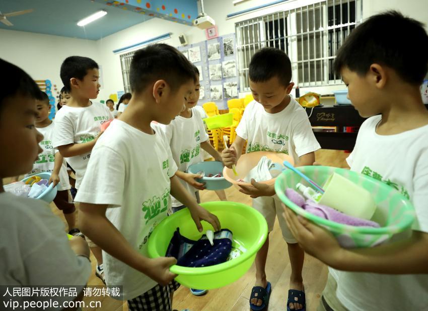 2017年6月16日,在安徽省滁州市全椒县庄曹大地幼儿园,几位小朋友收拾物品准备洗澡。(沈果/人民图片)