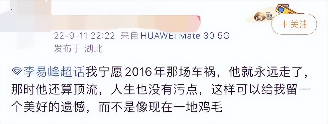 昨天有李易峰的粉丝发文称宁愿2016年车祸永远带走李易峰,“这样可以给我留一个美好的遗憾,而不是像现在的一地鸡毛”。不得不说流量没把粉丝当人,粉丝其实也没把流量当人。