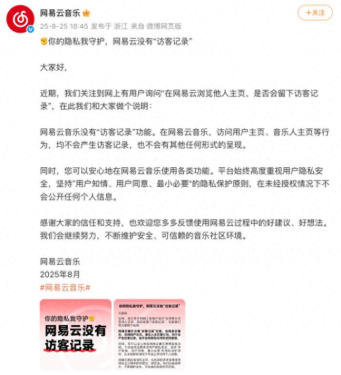 日前,@网易云音乐 发文称,网易云音乐没有“访客记录”功能。在网易云音乐,访问用户主页、音乐人主页等行为,均不会产生访客记录,也不会有其他任何形式的呈现。平台始终高度重视用户隐私安全,坚持”用户知情、用户同意、最小必要“的隐私保护原则,在未经授权情况下不会公开任何个人信息。