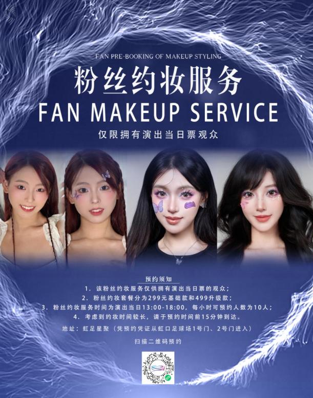 特别提示:演唱会期间,因虹足星聚处于演唱会内场区域,13:00-18:00仅限妆造预约客户和持有演唱会内场票的观众进入,营业时间至18:00止。