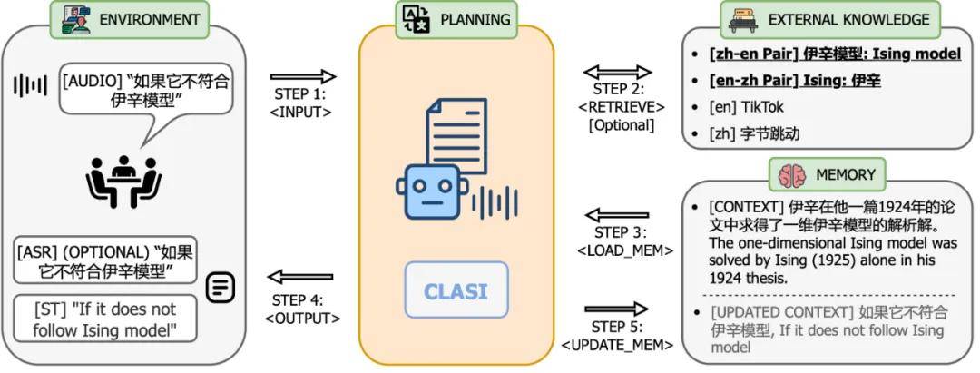 图 1:图示展示了 CLASI 的整体操作流程。在步骤 1 中,CLASI 处理当前输入的音频数据。接下来检索器会被激活(可选),从用户自定义的知识库中获取相关信息。在这个示例中,使用知识库中的翻译对 “伊辛模型: Ising model” 能够帮助模型输出正确的译文。在步骤 3 中,CLASI 从上一轮的记忆体中加载转写(可选)和翻译。接下来(步骤 4 和步骤 5),CLASI 可能会启用思维链(CoT)来输出转写(可选)和翻译结果,然后更新其记忆体。最后,返回步骤 1 以处理下一轮的语音。