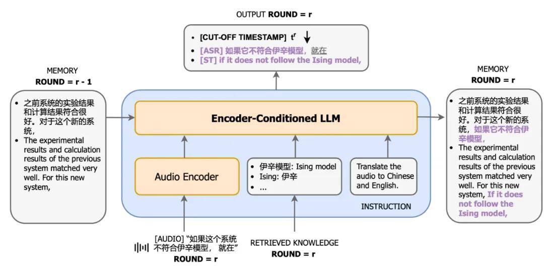图 2:CLASI 的结构图。在第 r 轮中,CLASI 将当前音频流、前序的记忆体(r-1)和检索到的知识(如果有)作为输入。CLASI 根据给定的指令输出响应,然后更新记忆体。同时,CLASI 还会输出截止当前,最后一个语义片段的截止时间戳。对于给定的示例,短语 “就在” 之前的内容被认为是完整的语义片段,所以截止时间戳就在此短语之前。
