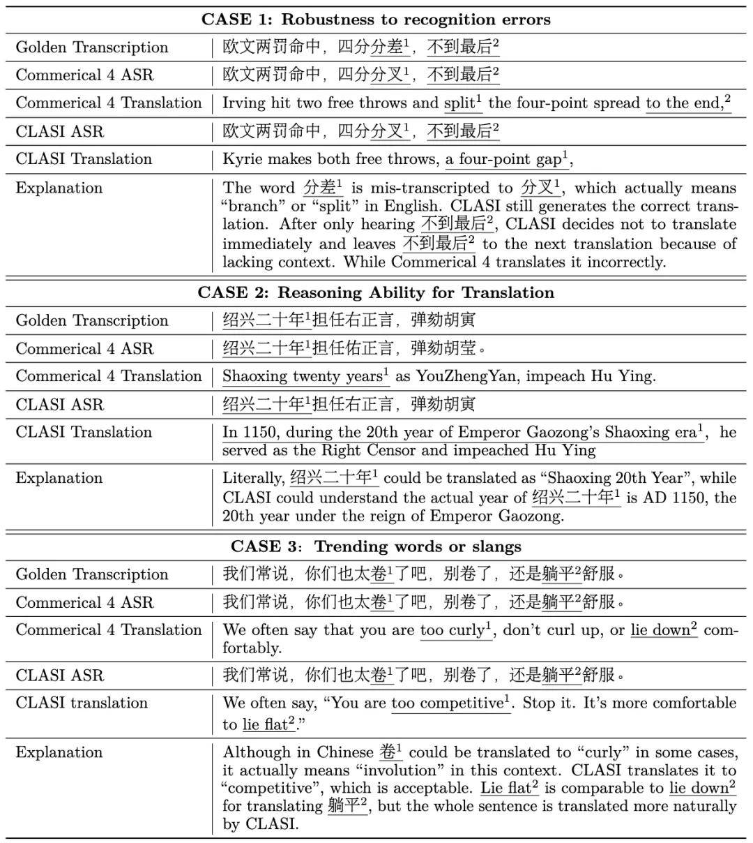 定量对比:研究人员分别在中英、英中翻译语向上,针对 4 个不同领域邀请专业的同传译员进行了人工评测,使用了与人工同传一致的评价指标:有效信息占比(百分制)。图中可以看到,CLASI 系统大幅领先所有商业系统和开源 SOTA 系统,并且在某些测试集上甚至达到或超过了人类同传水平(一般认为人类同传平均水平大概在 80%)。