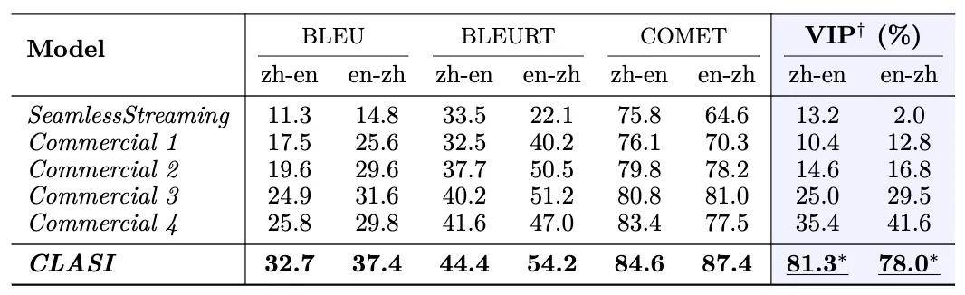 表 1:人工评测有效字段占比(Valid Information Proportion, VIP)中,CLASI 系统显著超过了其他所有竞品,并且在两个语向上均达到了 78% 以上的准确性。一般而言,可以认为人类同传的准确性在 70% 以上,理想情况下可以达到 95%,研究人员以 80% 的准确性作为高水平人类译员的平均标准。