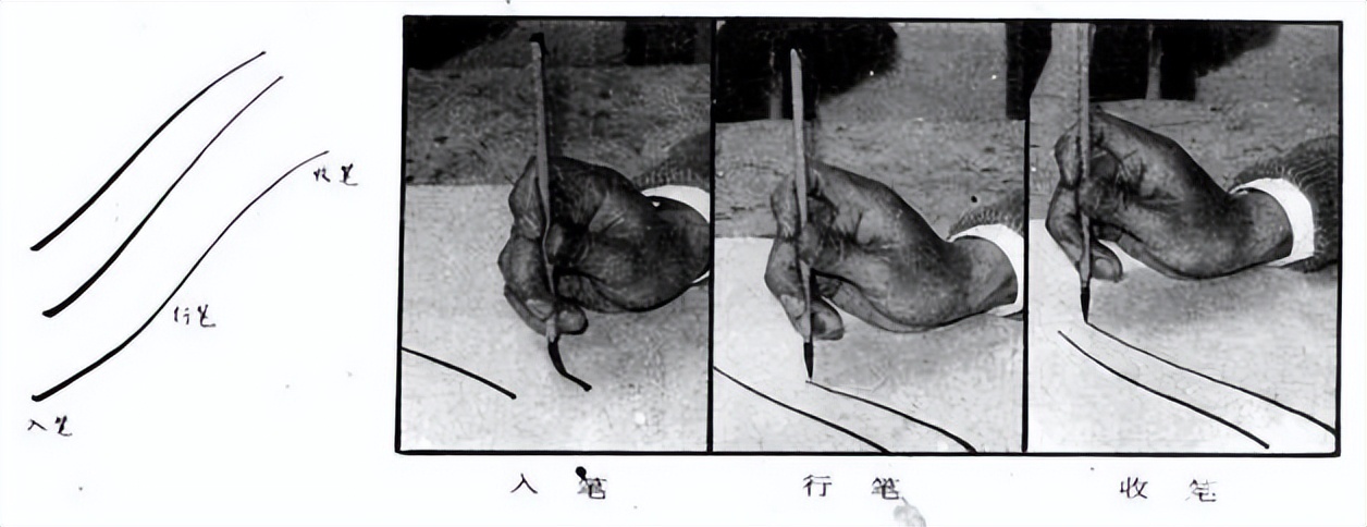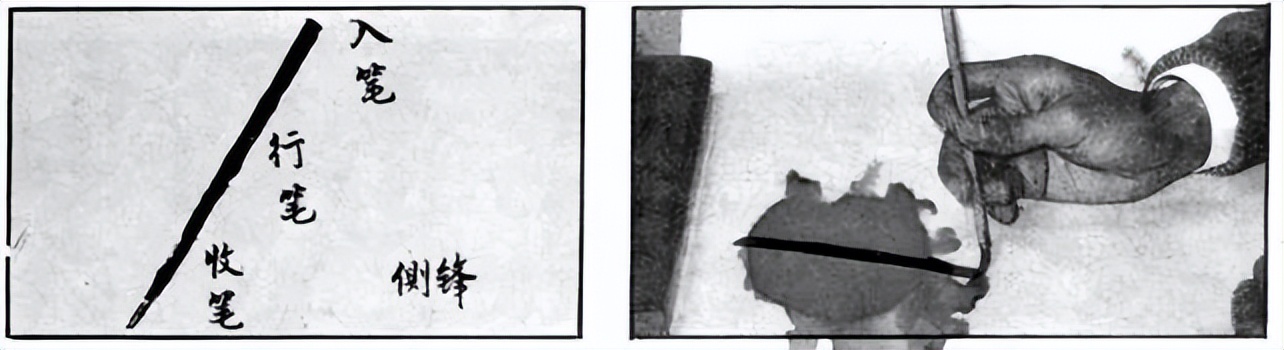 笔杆倾斜握在手中,行笔时笔尖倾斜一侧,笔尖一边线条光齐,笔身一边线条毛糙,行笔稍有颤动时,出现明显锯齿状的变化。