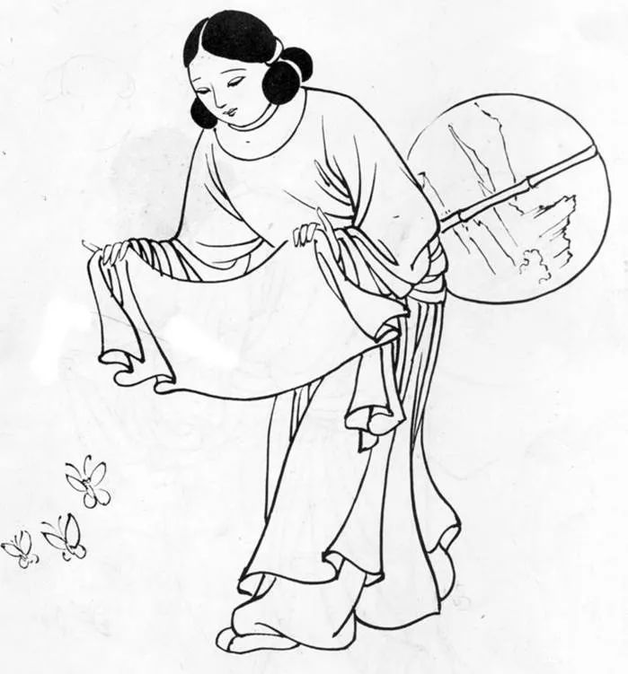 弯腰扑蝶的动态,衣纹的组织富于动感。