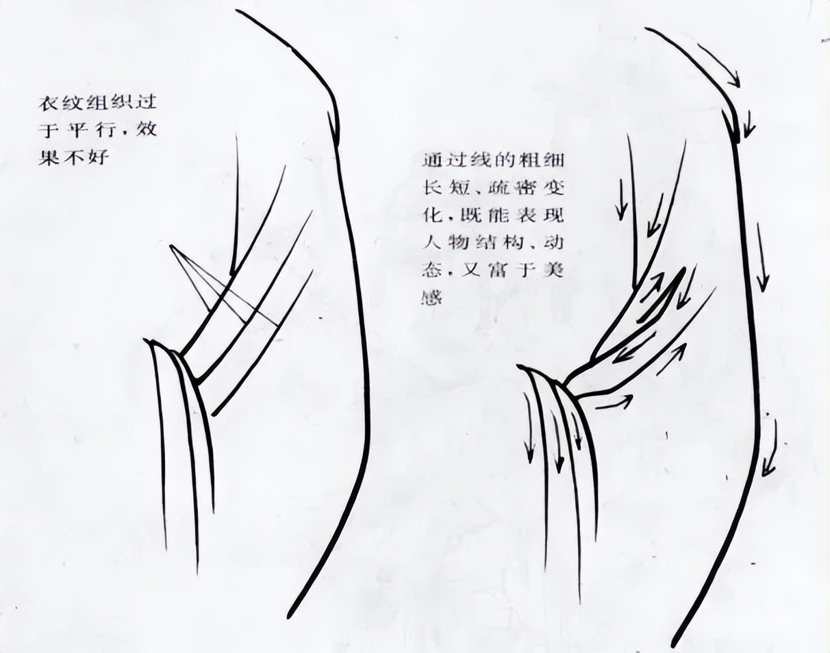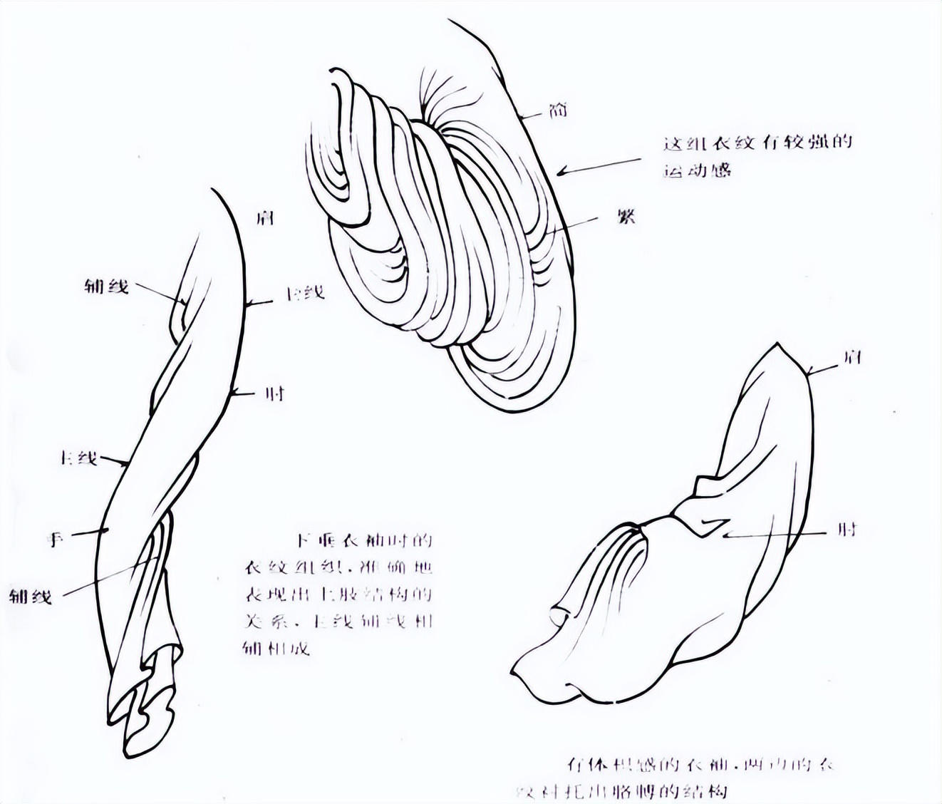 剖析左袖在不同动态时,衣纹的组织变化,可以加强对于衣纹与人体结构的关系的认识,从外看到内,可以理解衣纹的主线与辅线、繁与简、实与虚、密与疏的关系。