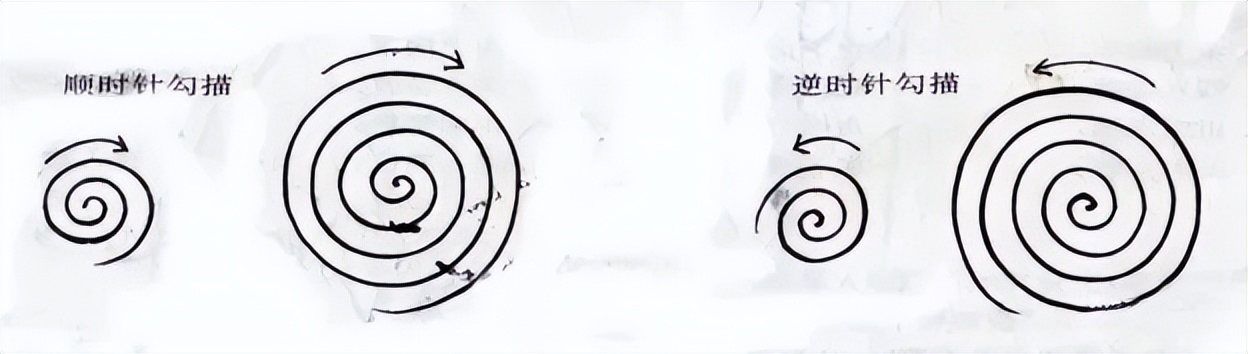 螺旋线练习——以指、腕运笔,由里向外顺、逆时针的勾描,线描要圆润匀细。