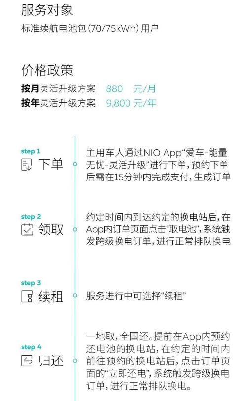 这个时候,他就可以去附近的换电站,花个几分钟十几分钟把自己的75度电池换成100度电池,并且在后面待在老家的两个月里每个月支付880的租金。等他从老家回来后,再去一次换电站,把临时租来的100度电池换回75度电池。