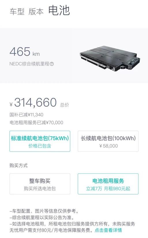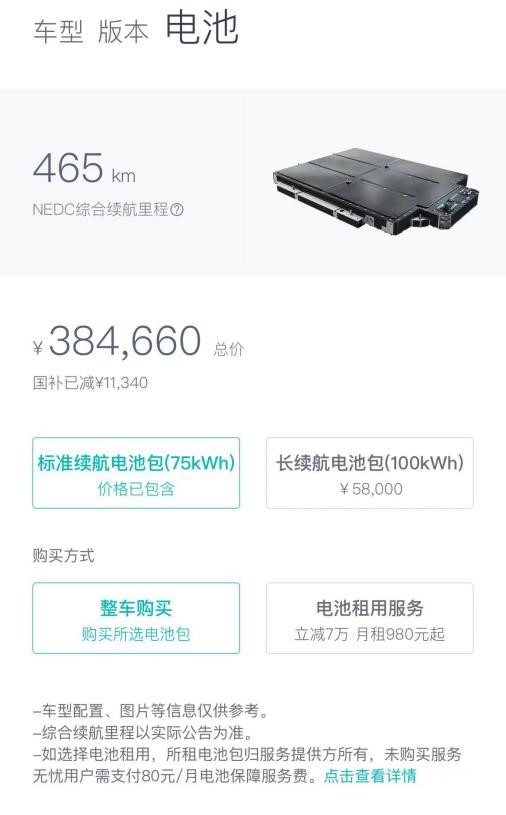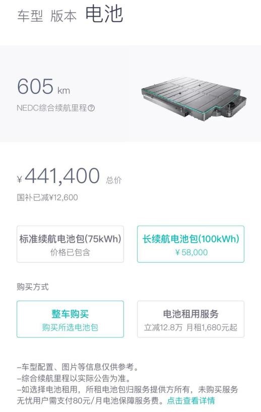 目前,蔚来提供租赁的电池有两款,75度的三元铁锂电池和100度三元锂电池,价格分别为70,000,和12,8000 。我们拿 蔚来EC6 ( 参数 | 询价 ) 的运动版举例。在不选装任何配置的情况下,整车购买的价格分别是396000,454000。(不算补贴)