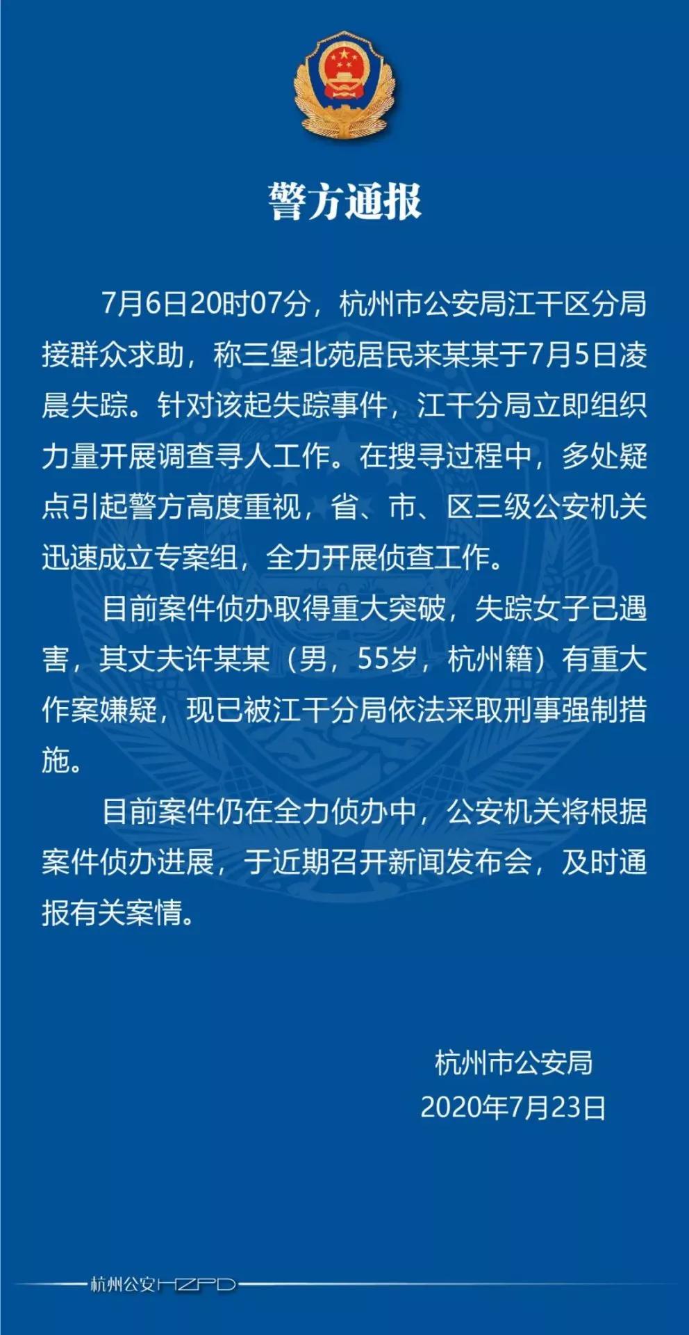 7月23日,杭州公安发布通报:“杭州女子离奇失踪案”失踪女子已遇害,其丈夫许国利有重大作案嫌疑,已被依法采取刑事强制措施。