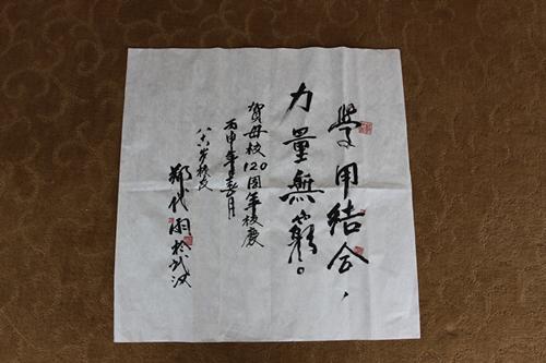 临别时,郑老把一套珍藏多年、曾经伴随了他多次带电作业的带电工作服捐赠给母校留念,还专门为母校亲笔题写了“学用结合,力量无穷”的书法作品。镜头前,郑老真诚地表达了对母校、对素未谋面的校友们的诚挚祝福:“母校120周年校庆,很高兴。我离开母校都快66年了,很想念大家。感谢学校的培养,使我掌握了知识,了解了理论和实践的重要性......在学校120周年校庆之际,感谢老师,感谢领导,感谢同学,感谢校友!”