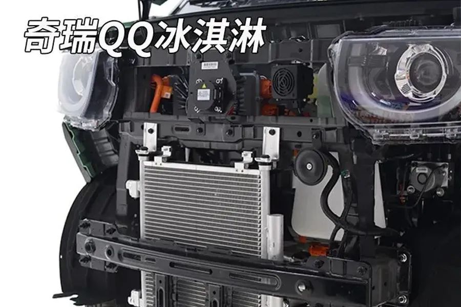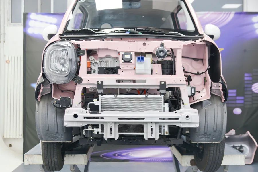 拆掉前保险杠,发现防撞梁是有的,一根非常薄的单层冲压钢板防撞梁,厚度只有1.09毫米,只能覆盖车头的66.08%。车头整体结构设计和其他微型小电车相差不大。