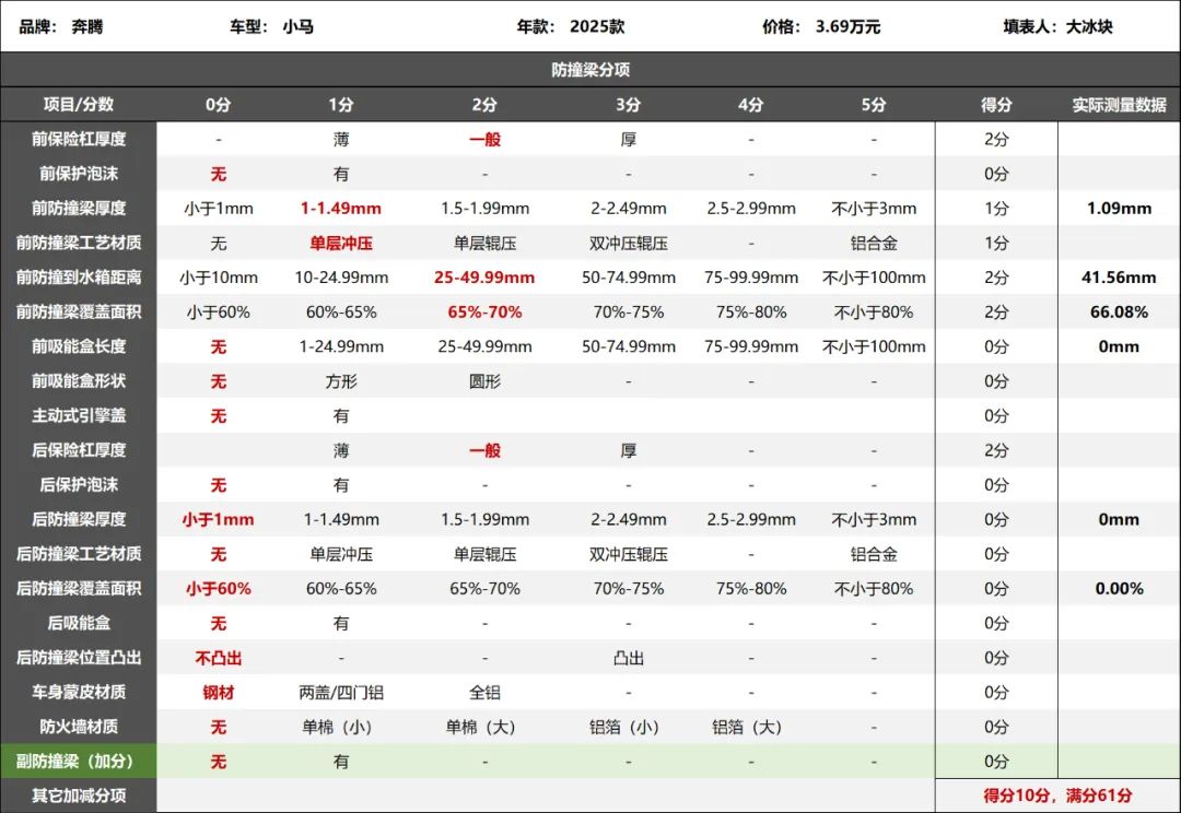从这辆奔腾小马的防撞梁就能看出,虽然整车设计符合目前国家法规标准,可以合法上市销售,但由于成本所限,这种微型小车基本上都是这样,半斤八两,毕竟价格在这摆着呢。不过,这辆车是正经的钢板车身,纵梁、shotgun也都没缺失,比我们拆过的那些用塑料片做覆盖面的车来说,强太多了,最起码是辆正经工业体系下生产出来的车。