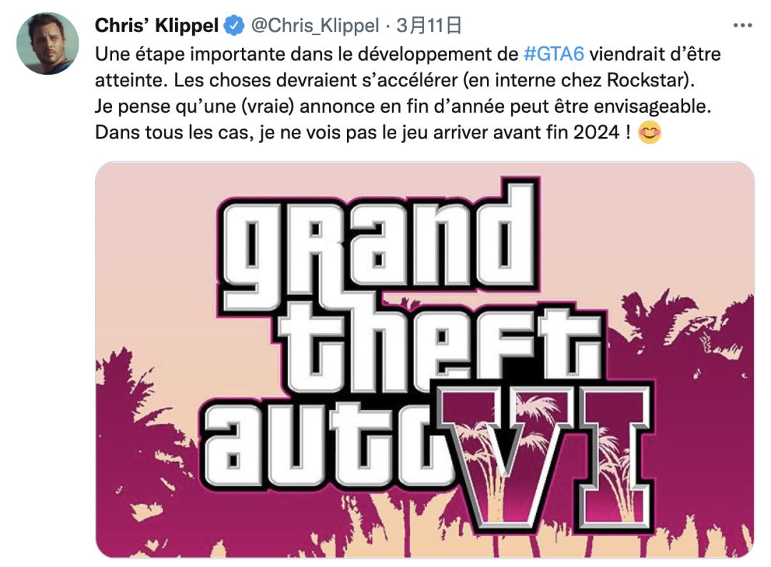 就在上月法国游戏经销公司Rockstar Mag的创始人,也是GTA系列知名爆料人Chris Klippel曾经曝出过一条不太妙的消息:“《GTA6》开发的重要一步(新建文件夹)刚刚完成,Rockstar内部应该加快进度了。他们有可能在年底正式公布《GTA6》,但无论如何,我认为游戏不会在2024年底之前到来。”