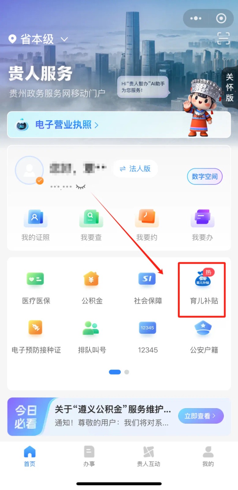 进入支付宝APP首页,搜索框搜索“贵人服务”,点击“贵州育儿补贴申领”,即可进入专题,并订阅上线通知。(目前申领入口暂未开通,大家可以先订阅上线通知)