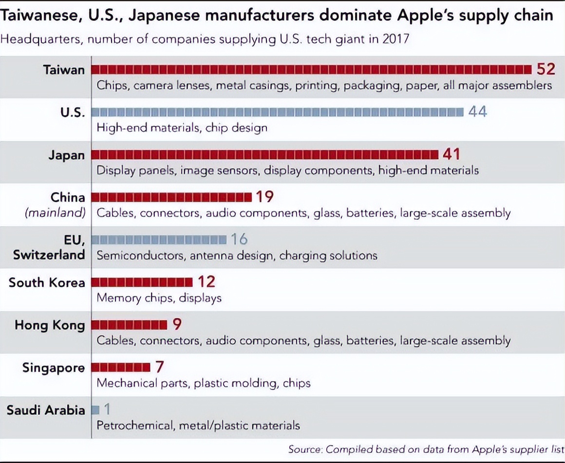 如今的苹果就是这样,以手机为例,台湾厂商以52个占据了苹果手机元器件供应的最强主力,其中包括最主要的芯片制作。美国的供应商以44个排名第二,日本供应商排名第三,大陆供应商排名第四,瑞士排名第五,韩国排名第六。