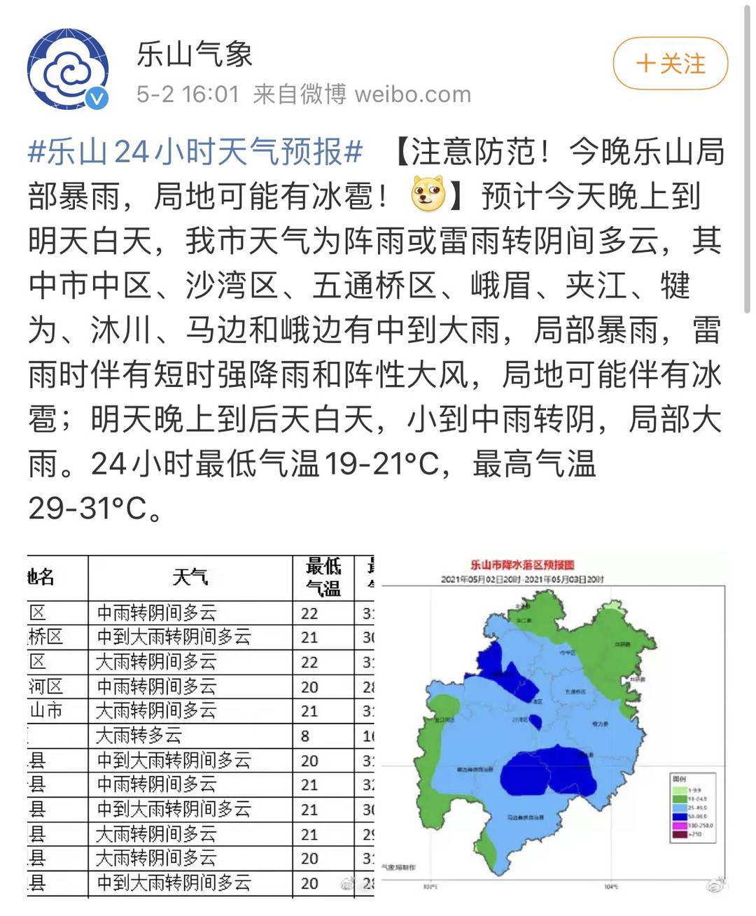 此外,封面记者从乐山市气象局获悉,预计今天晚上到明天白天,乐山天气为阵雨或雷雨转阴间多云,其中市中区、沙湾区、五通桥区、峨眉、夹江、犍为、沐川、马边和峨边有中到大雨,局部暴雨,雷雨时伴有短时强降雨和阵性大风,局地可能伴有冰雹;明天晚上到后天白天,小到中雨转阴,局部大雨。