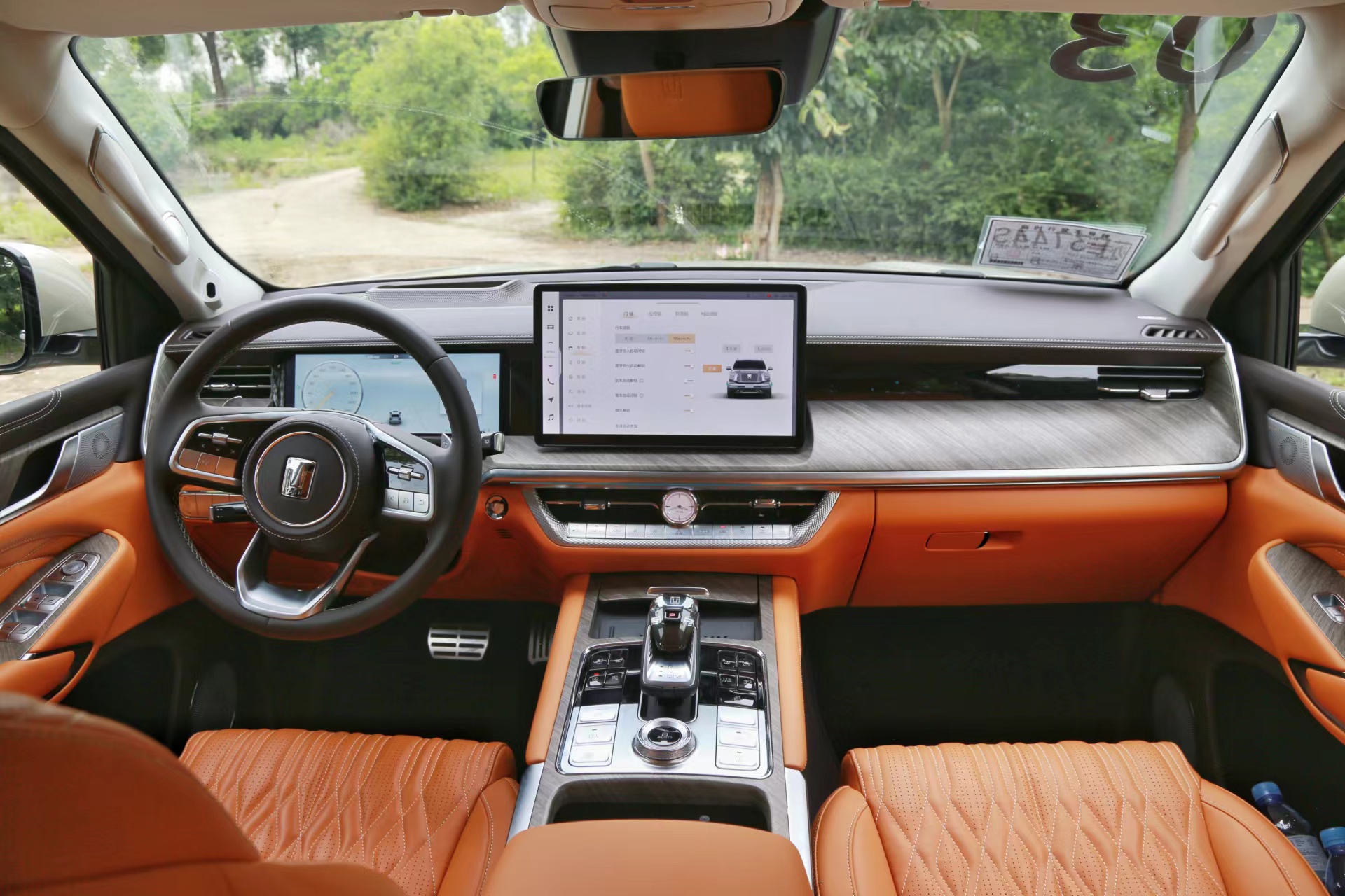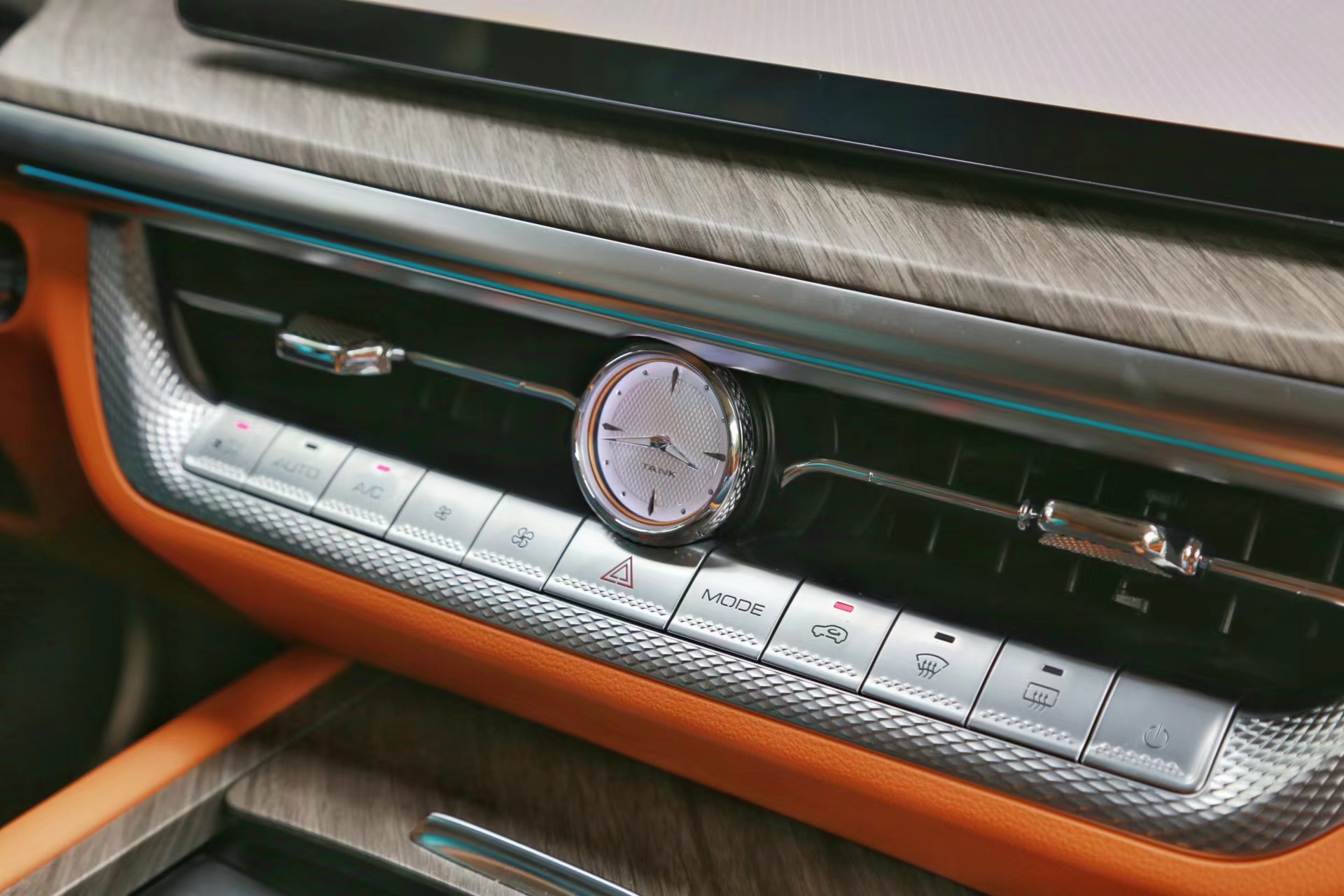 我们所试驾的车型采用了黑灰橙配色方案,除此之外,厂家还提供黑灰配色和紫灰白配色方案。中控台面采用了大量软包蒙皮以及真实缝线,搭配灰色木纹装饰,质感上层,很有豪华家具风格。副驾驶台面饰板还具备RGB色调繁星灯。