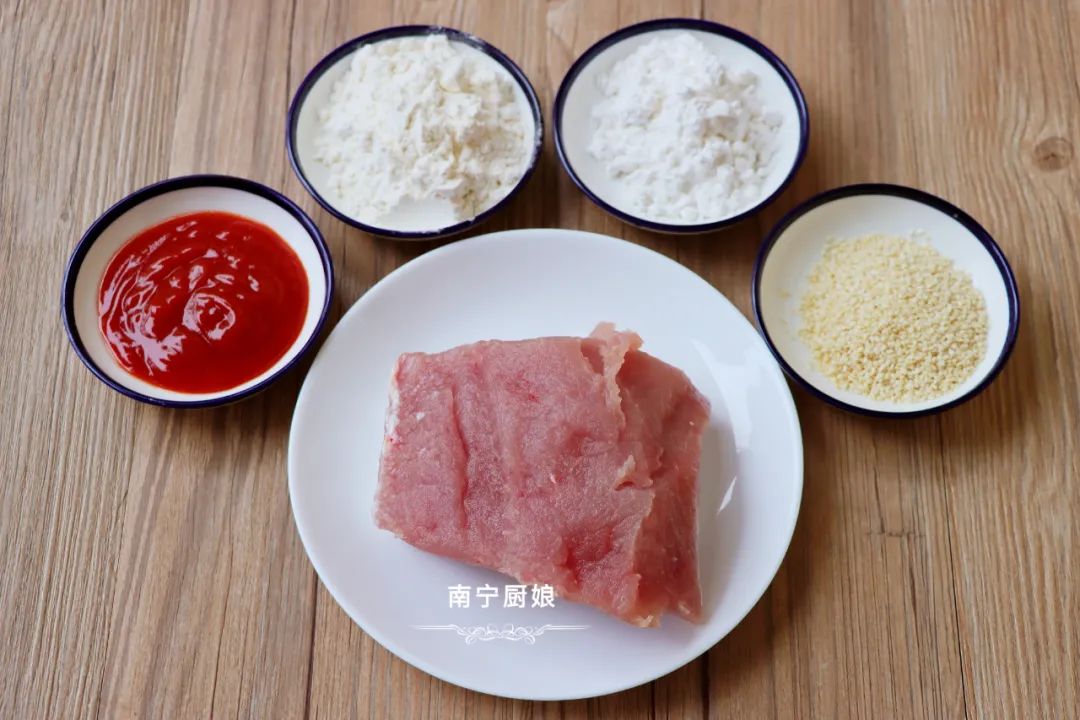 准备食材:猪里脊250克,面粉,淀粉,番茄酱,料酒,白砂糖,生抽,白芝麻。