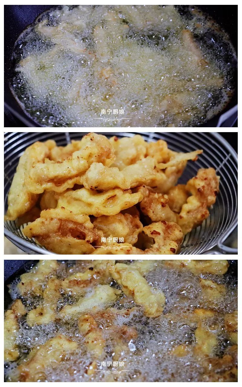 第二步用大火炸,让里脊肉外部更加酥脆,如果全程用小火,很容易导致里脊肉外部不脆,吃起来特别绵软。