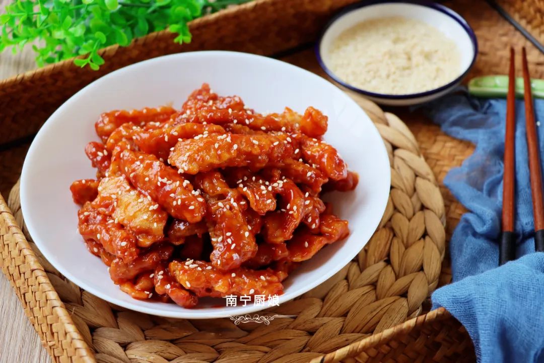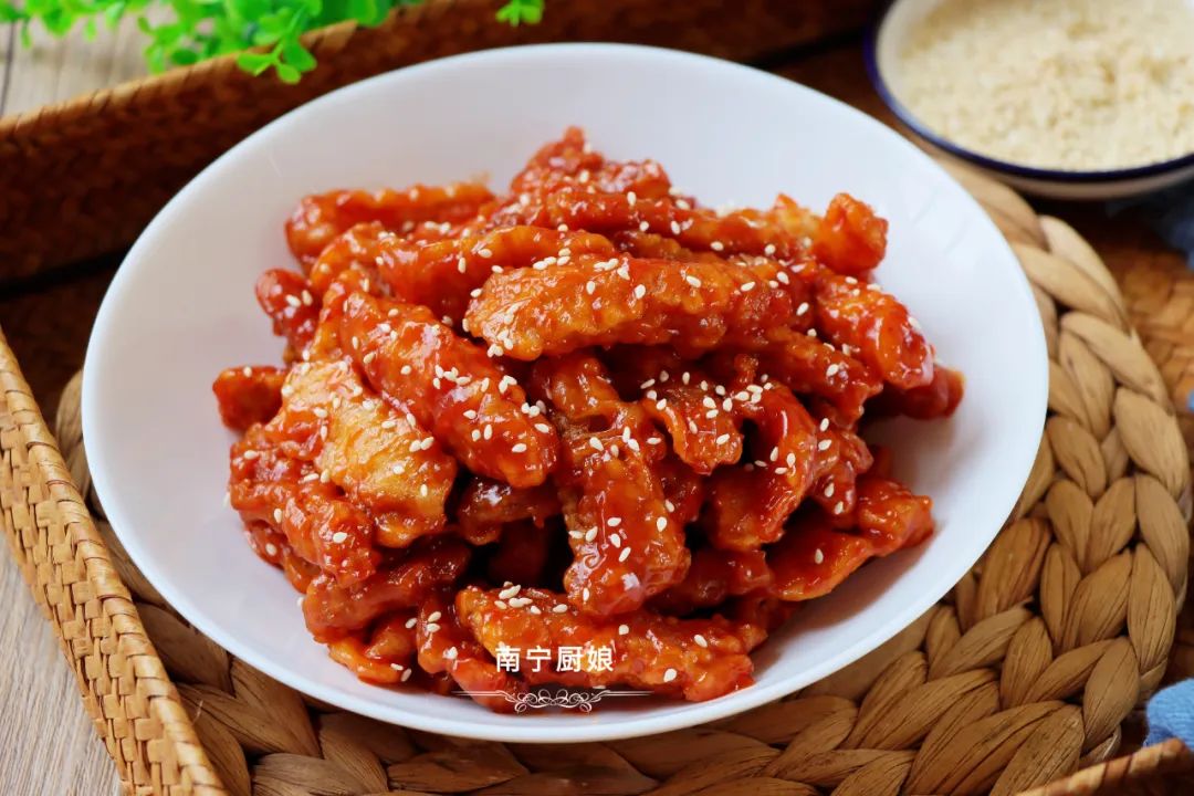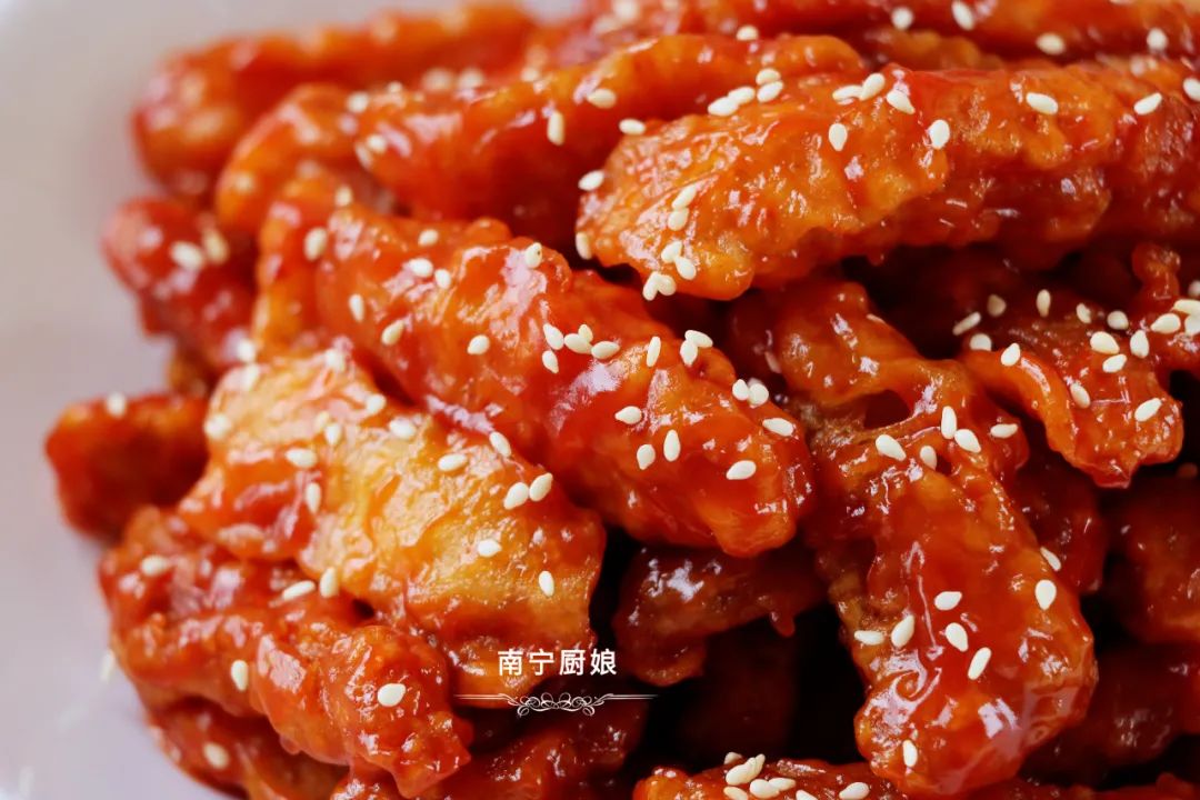 等里脊肉全部裹上酱汁之后,装盘撒上白芝麻就可以食用了。