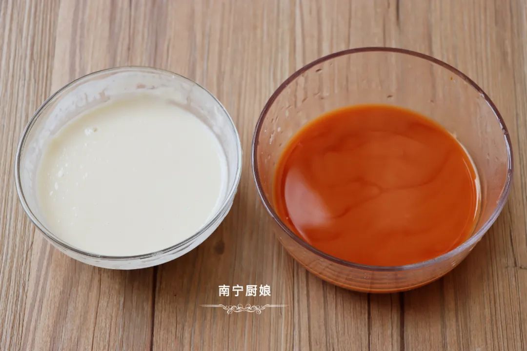 提示:面糊搅拌成用筷子或是手抓起来,可以拉成丝的情况,就可以了。