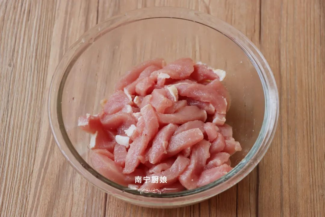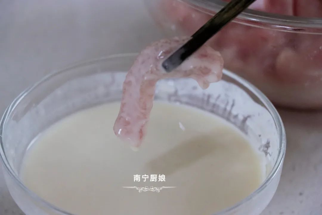 提示:里脊肉不要切得太细,也不要切得太粗,切得太细,经过油炸之后口感会变硬。