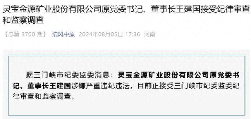 8月5日,“清风中原”发文,据三门峡市纪委监委消息:灵宝金源矿业股份有限公司原党委书记、董事长王建国涉嫌严重违纪违法,目前正接受三门峡市纪委监委纪律审查和监察调查。