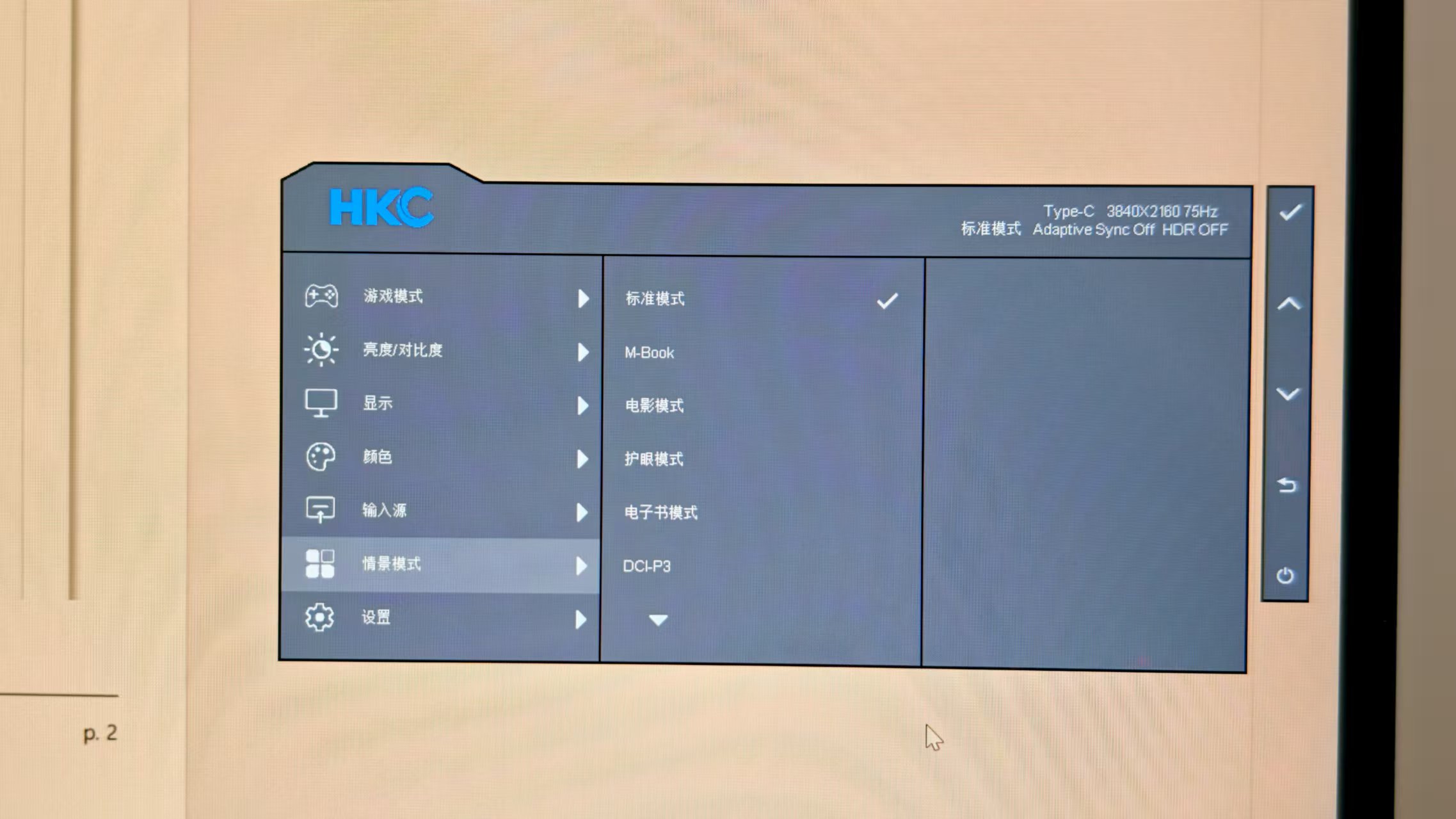 当然咱们主要还是看情景模式,可以看到有标准模式、M-Book、电影模式、护眼模式、电子书模式、DCI-P3以及sRGB与Adobe RGB模式。