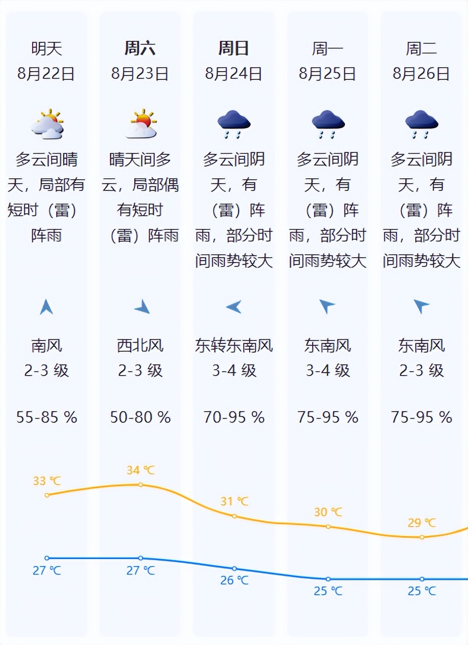 预计22-23晴天间多云,局部有短时阵雨,天气炎热,22日气温27-33℃;